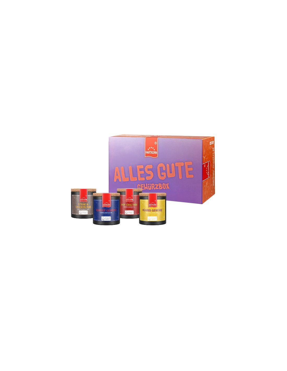 Kräftig, deftige Wünsche gehen raus mit der Hartkorn Gewürzbox für Männer. Angefangen beim feurig scharfen Hot Chili Mix, über das würzige Burger Gewürz bis hin zum Frühstücksklassiker dem Rührei Gewürz und dem Traum einer jeden BBQ-Party - dem Steak & Chicken Gewürz - ist die Alles Gute Gewürzbox ein echtes Must-have.